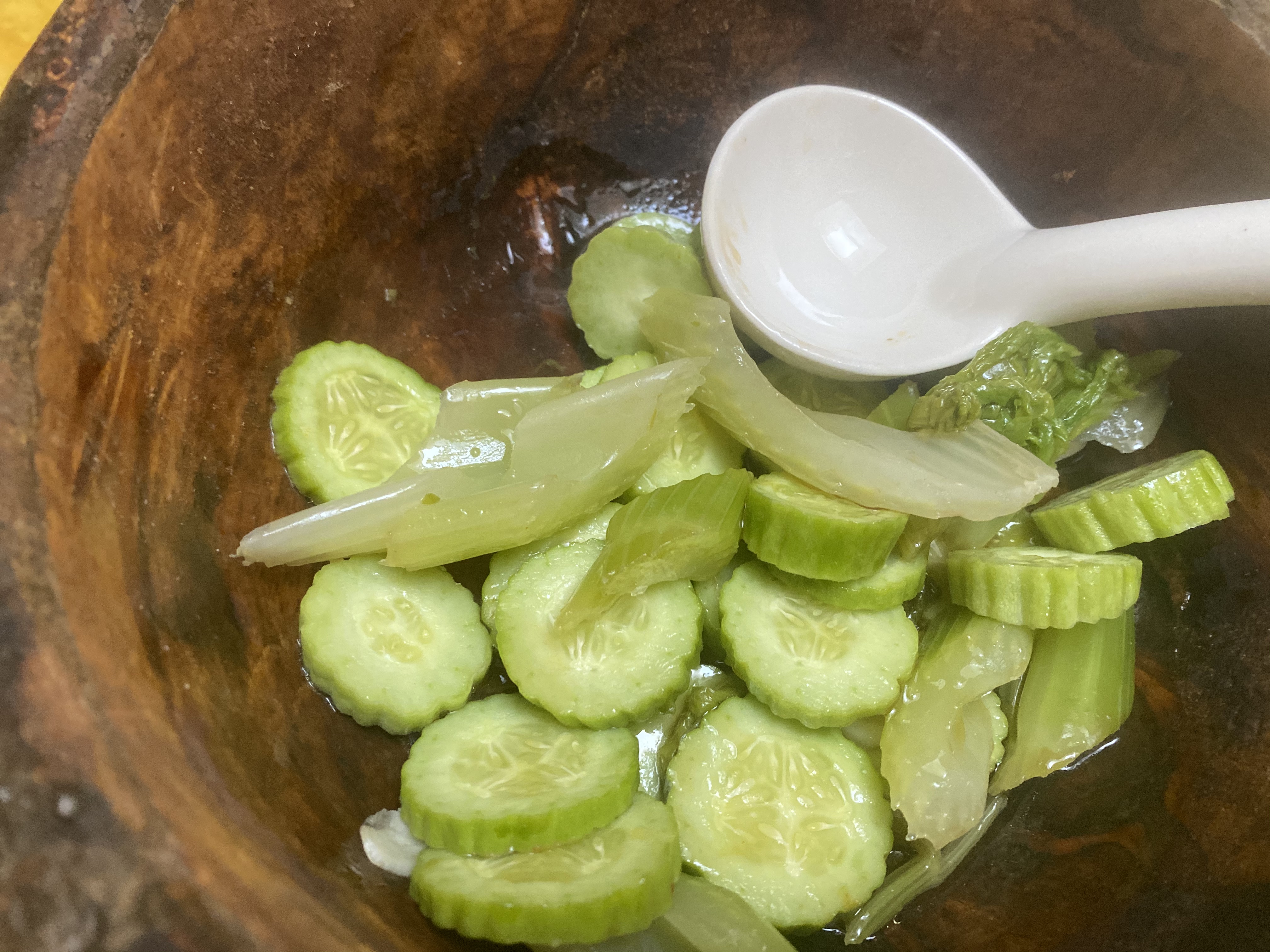- Cold Cucumber and Celery: My vegetable garden has several varieties of cucumbers this year. The most fragrant ones are green Chinese prickly cucumber, yellow lemon cucumber and white Armenian cucumber. Mixed them with scalded celery, chopped garlic, sesame oil, rice vinegar, salt and pepper and a little sugar. It is a really cool and tasty summer dish.