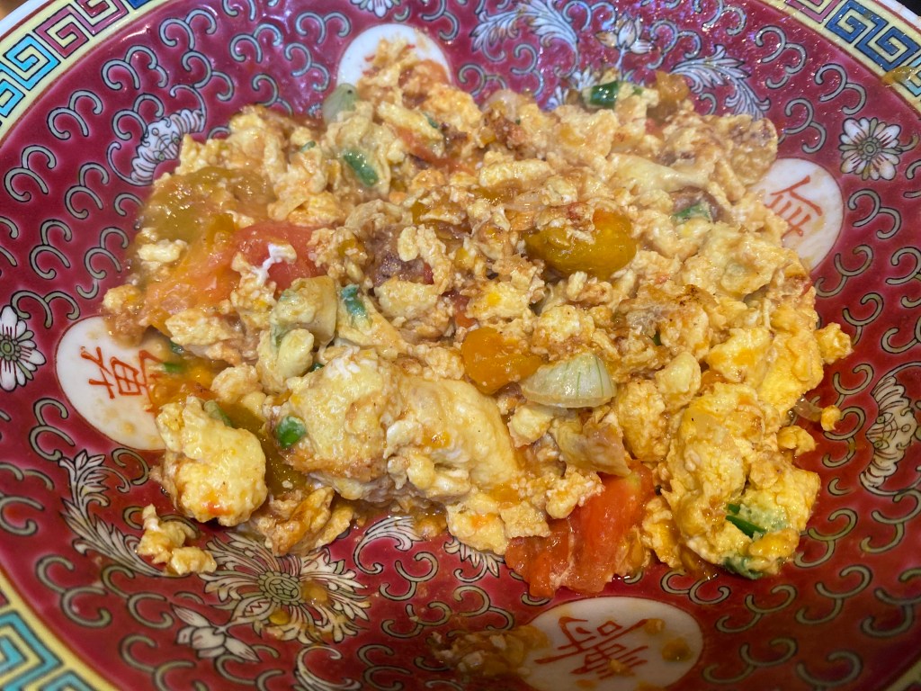 - Scramble Eggs with Double-colored Tomatoes: This everyday home cooking dish is special, because the red tomatoes, yellow tomatoes and green scallions all came from my own produces. Eggs are “matchmakers”, combining red tomatoes and yellow tomatoes together.