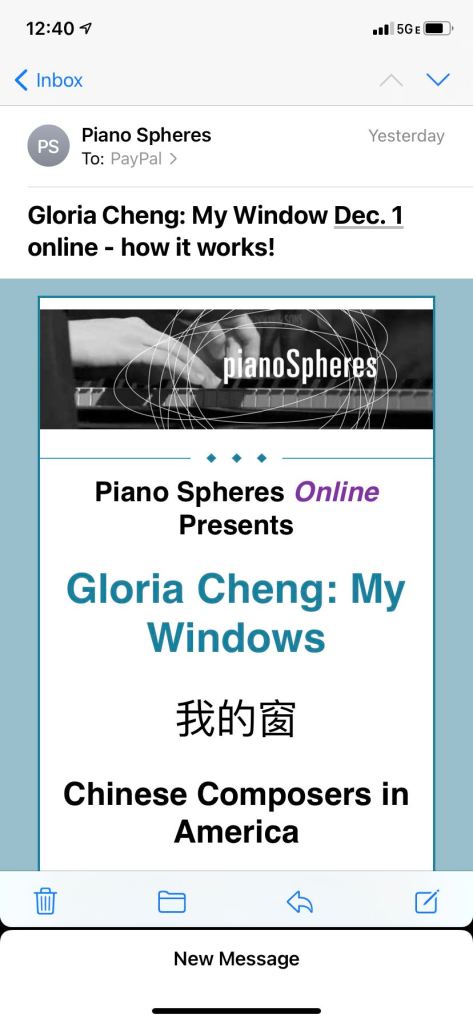 Here is second movement of Beethoven’s Pastoral Symphony, “Scene by the brook”, derived from this movement, I composed A Flowing Brook in Yunan.  Next Tuesday (12/1), the contemporary music specialist pianist Gloria Cheng will have her “My Windows”, she will be performing: