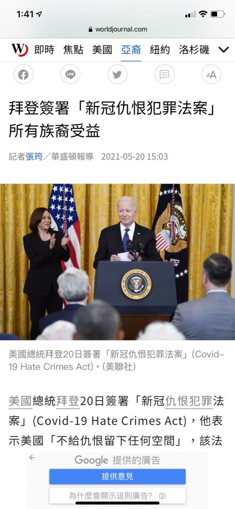 Biden said that in the face of hatred, it is important to speak up. Silence is complicity. Now that the “Covid Hate Crimes Act” has become a reality, we need to continue and unite to promote the implementation of the Act. Hope and love are contagious.