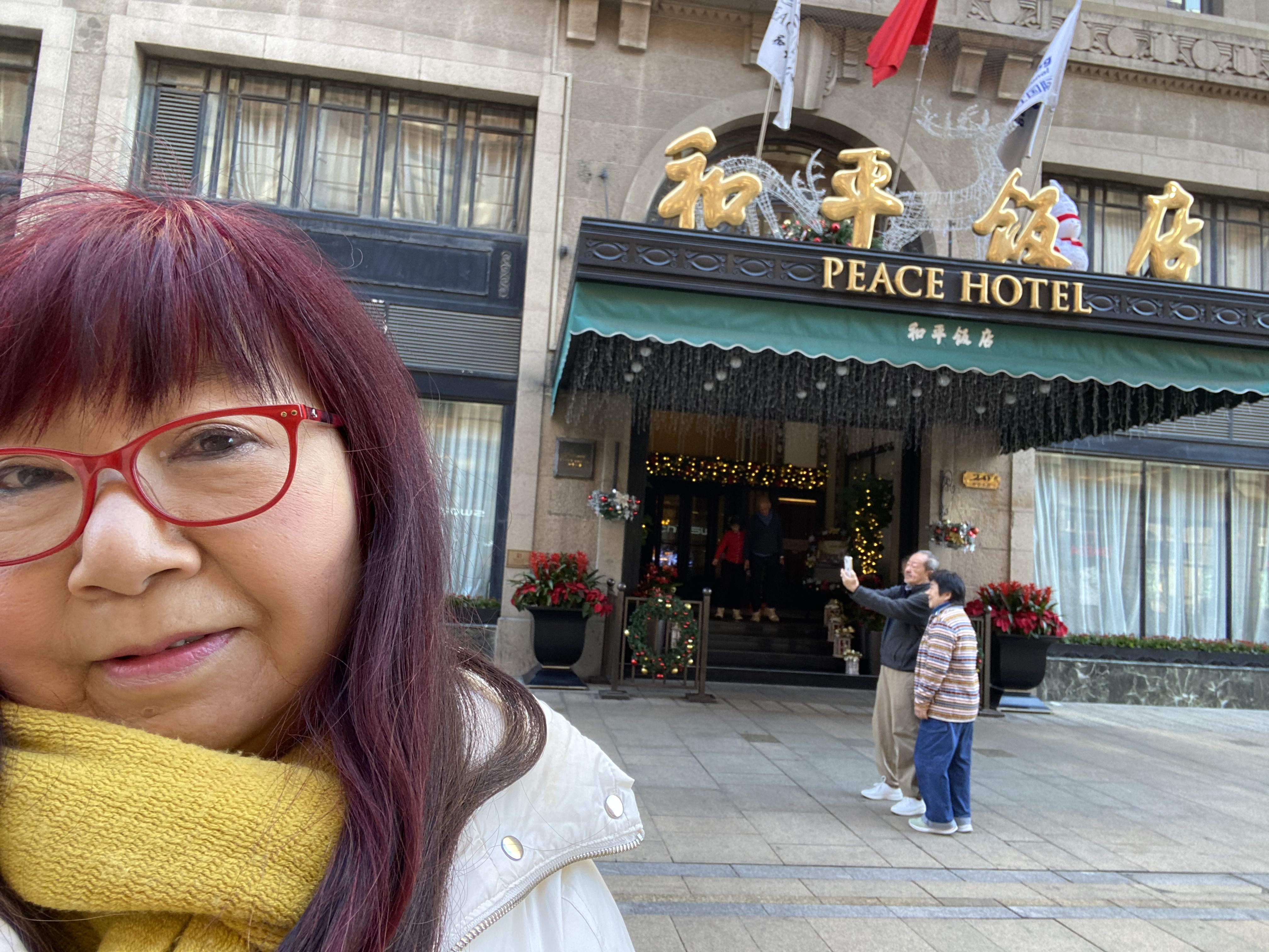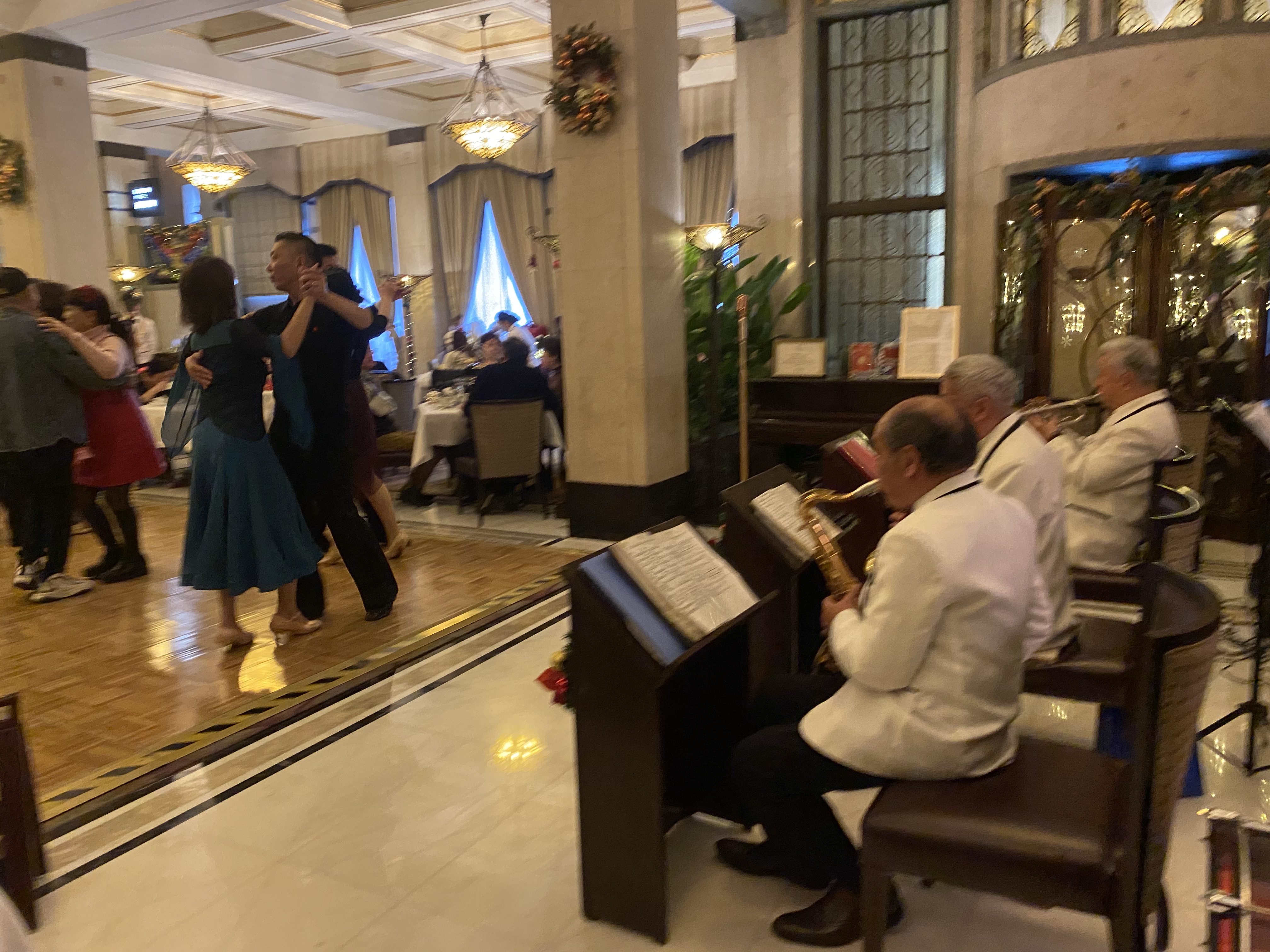 The Bund, the former Shanghai International Settlement, which runs along the western bank of the Huangpu River. It has nearly 2 hundreds of years of vicissitudes. It is the showcase of architecture of eclecticism: particularly Gothic, Baroque, Neoclassical, Romanesque, Art Deco, and Renaissance architectures. I especially like the art deco architectural style here. The famous Peace Hotel (Sassoon Building) is especially enchanting. I remember as a building with a green hat when I was a child. Before I left China 37 years ago, I came here to practice my English with a group of foreigners. I had a great memories here…Years ago, when my father was alive, I took him and my mother to the Peace Hotel to listen to the “Old Men Jazz Band”. It’s a perfect place to learn Shanghai history. Nostalgia for Old Shanghai has long held a fascination for Chinese and Hollywood filmmakers. It is the movie sites for many movies, such as Steven Spielberg’s Empire of the Sun and Zhang Yimou’s Shanghai Triad. This time we took our mother enjoying the afternoon tea and the band while watching people waltzing. Peace Hotel is full of charms. It’s ready for Christmas with beautiful decorations.