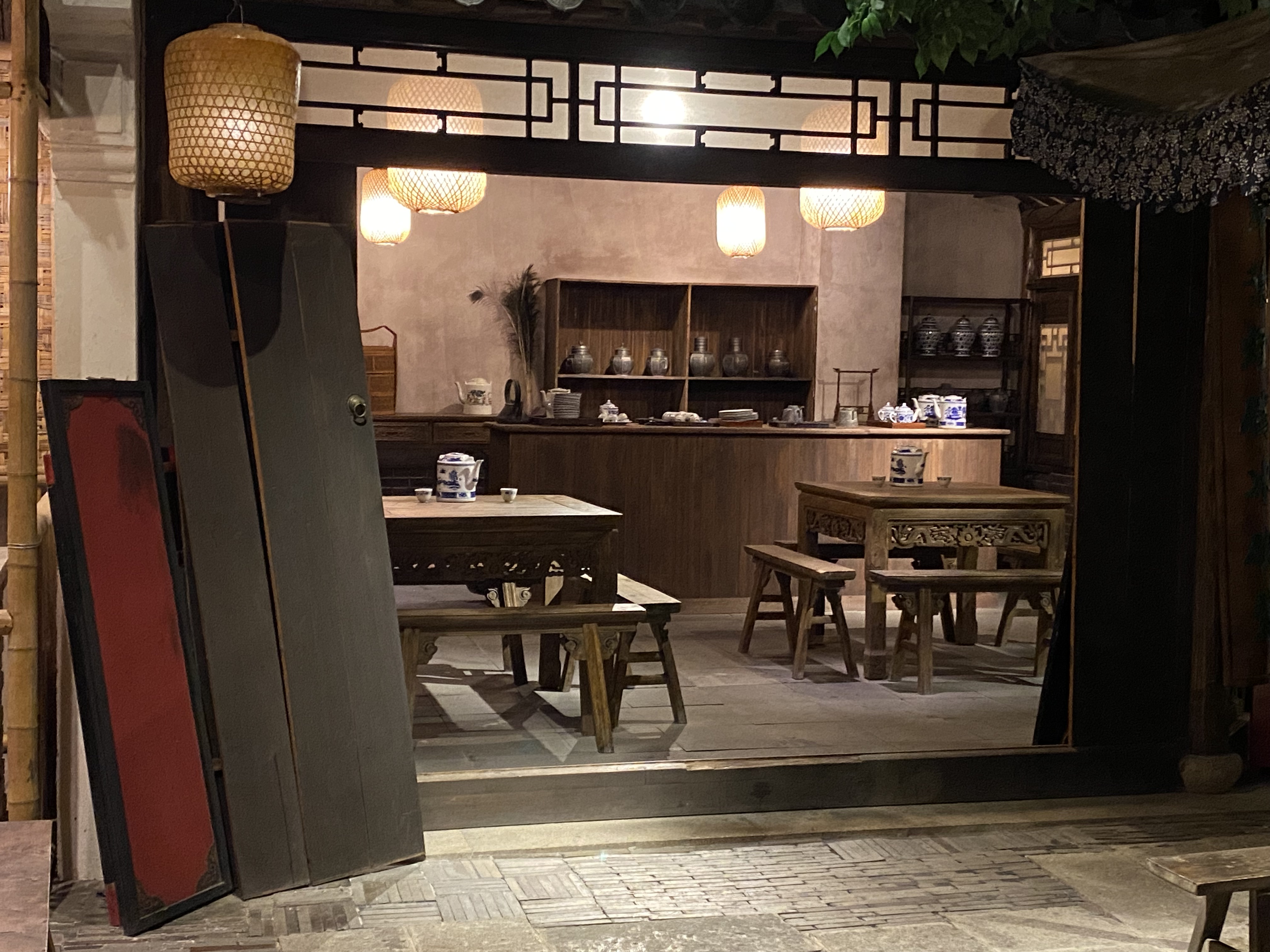 The style of Guangfulin’s “Duoyun Books” is in sharp contrast to the style of the “Duoyun. Books” in Pudong: one is modernistically overlooking the magical city; one is inn Chinese traditional down-to-earth antique Huizhou style. There are bleached walls, black tiles, horse heads decarations,, and embossed winter melon beams on the patio. I met a Shanghai couple here. They warmly invited me to sit down to chat while cracking melon seeds and having teas.