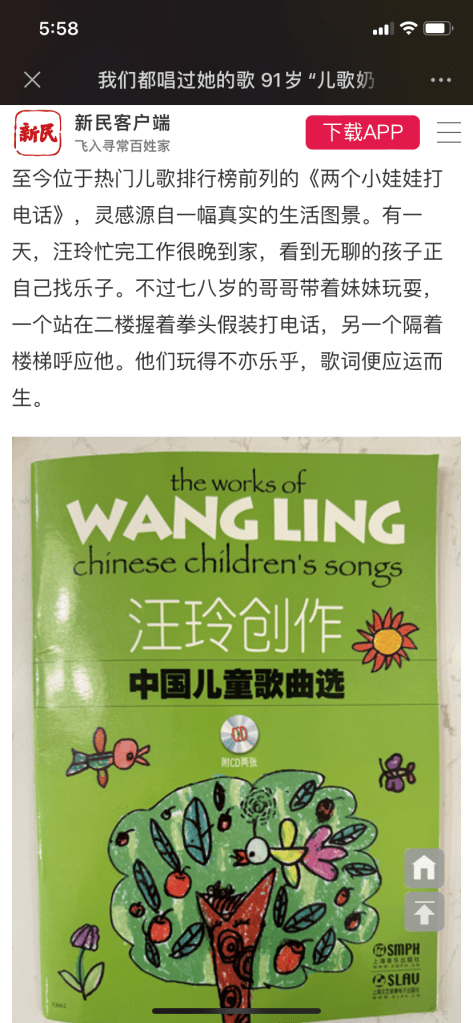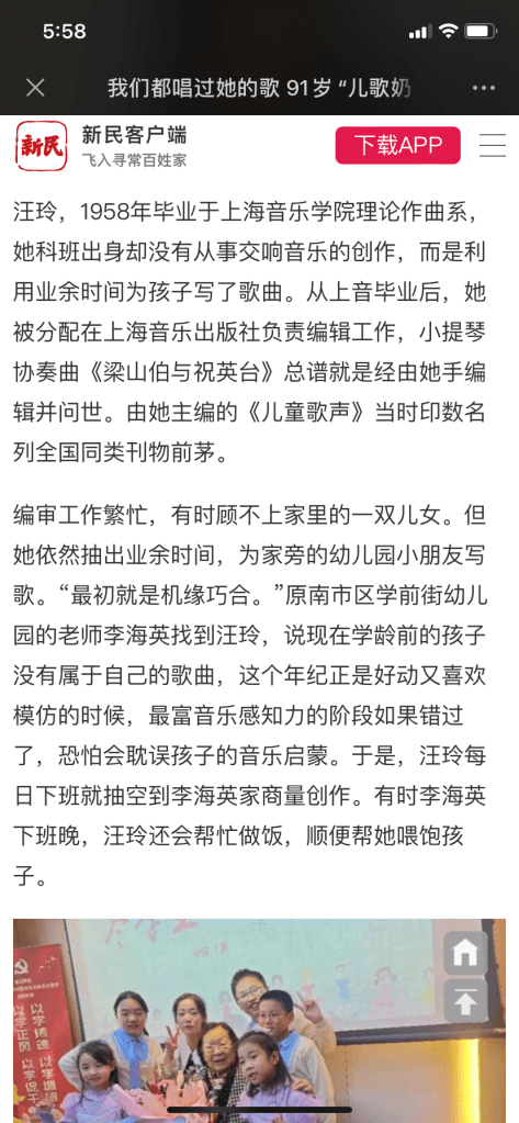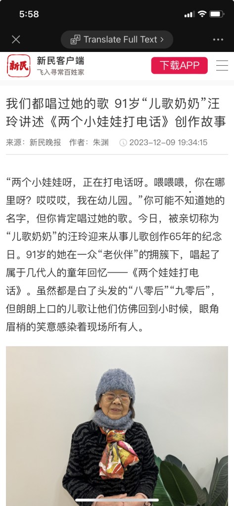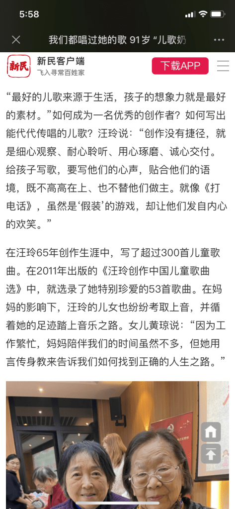 My mother was a well-known children’s song writer in China. After she immigrating to UK 23 years ago, she was not forgotten by her hometown. We had a joyful gathering with her former colleagues and the composers she trained. A reporter from “Xinmin Evening News” also interviewed my mother. We were all so proud of our 91-year-old mother!